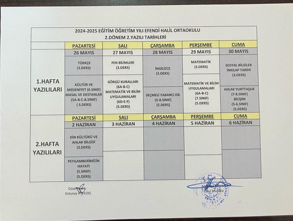 EFENDİ HALİL ORTAOKULU 2.DÖNEM 2.YAZILI SINAV TAKVİMİ